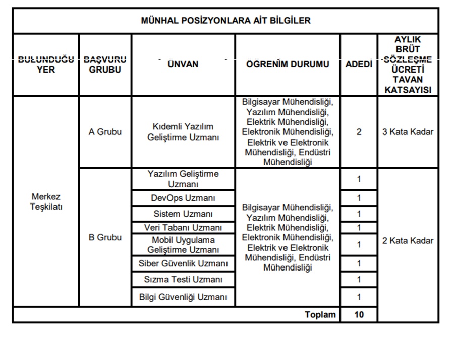 Alım yapılacak pozisyonlar, Kıdemli Yazılım Geliştirme Uzmanı, Yazılım Geliştirme Uzmanı, DevOps Uzmanı, Sistem Uzmanı, Veri Tabanı Uzmanı, Mobil Uygulama Geliştirme Uzmanı, Siber Güvenlik Uzmanı, Sızma Testi Uzmanı ve Bilgi Güvenliği Uzmanı olarak sıralanıyor.